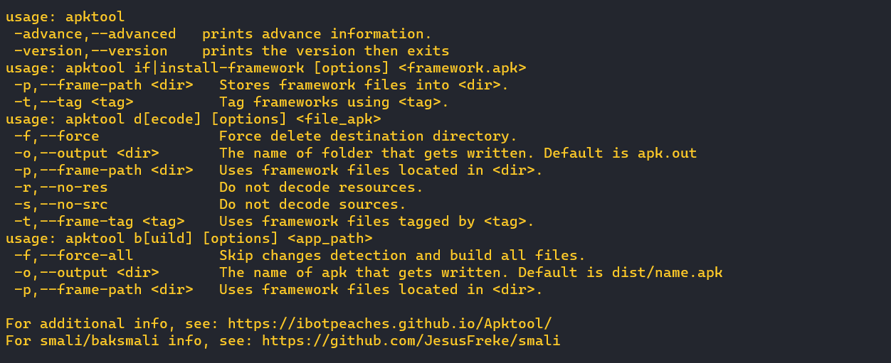 apktool λͺ λ Ήμ΄λ₯Ό μ λ ₯νμ¬ μ¬λ¬ μ΅μ λ€μ΄ λνλλ©΄ μ€μΉκ° μλ£λ κ²μ λλ€.